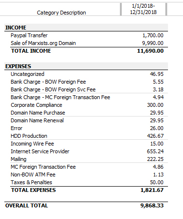 We started 2018 with US$6,799.36 in our bank acount, and ended the year with US$16,667.69. For the first three quarters of the year, our average quartely balance was US$6,287.18. We received a US$9,990.00 cash infusion in December 2018 from the sale of our marx.org domain name.