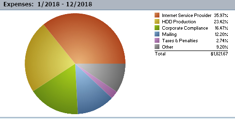Our second greastest expense was the investment made in producing and distributing the portable HDDs of the archive. That accounted for 35.62% of our expenses, between purchases of blank HDDs and mailing costs. We invested US$648.92 in the HDD production and distribution. However, sales of the HDDs brought in a gross US$2,428.8 into our PayPal account, giving us a gross profit on the HDDs of US$1,779.88.