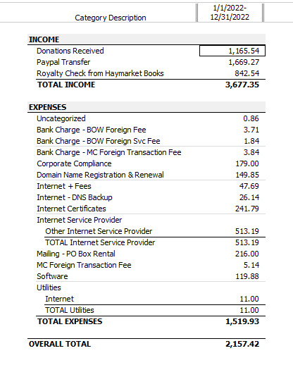 In addition, we received US$842 from a book publisher, thanks to Tim and David, who designated the MIA as payee for the royalties on the volumes of Eugene Debs' writings they have edited.