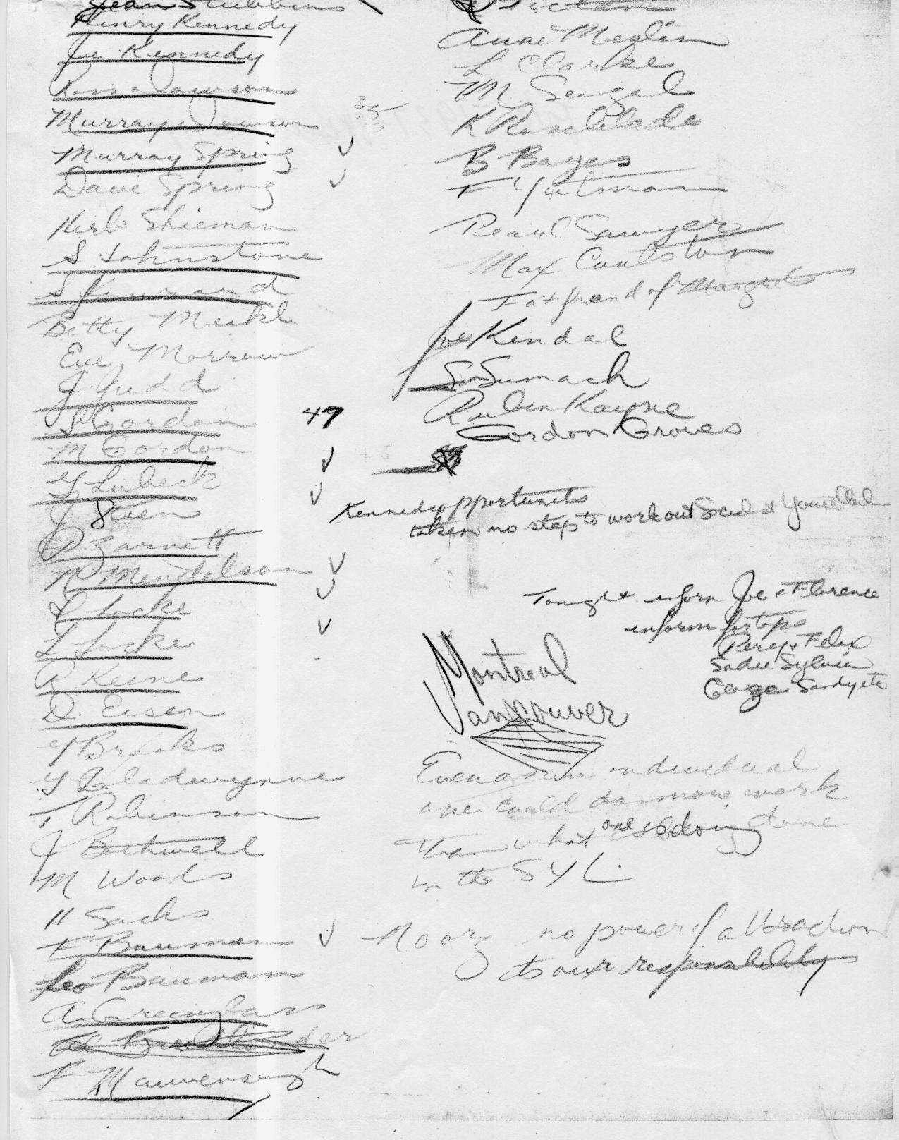 March 1st 1937 | Rough Notes by Ross Dowson—names of majority of activists of SYL an analysis of the results of entry by the Spartacus Youth League into the CCYM (CCF youth); the lack of progress of recruitment and education in the four units of CCYM; the loss of activism of ex-SYL comrades engaged in entry SYL Activists List 1st page of lists of activists 2nd page of lists of activists |