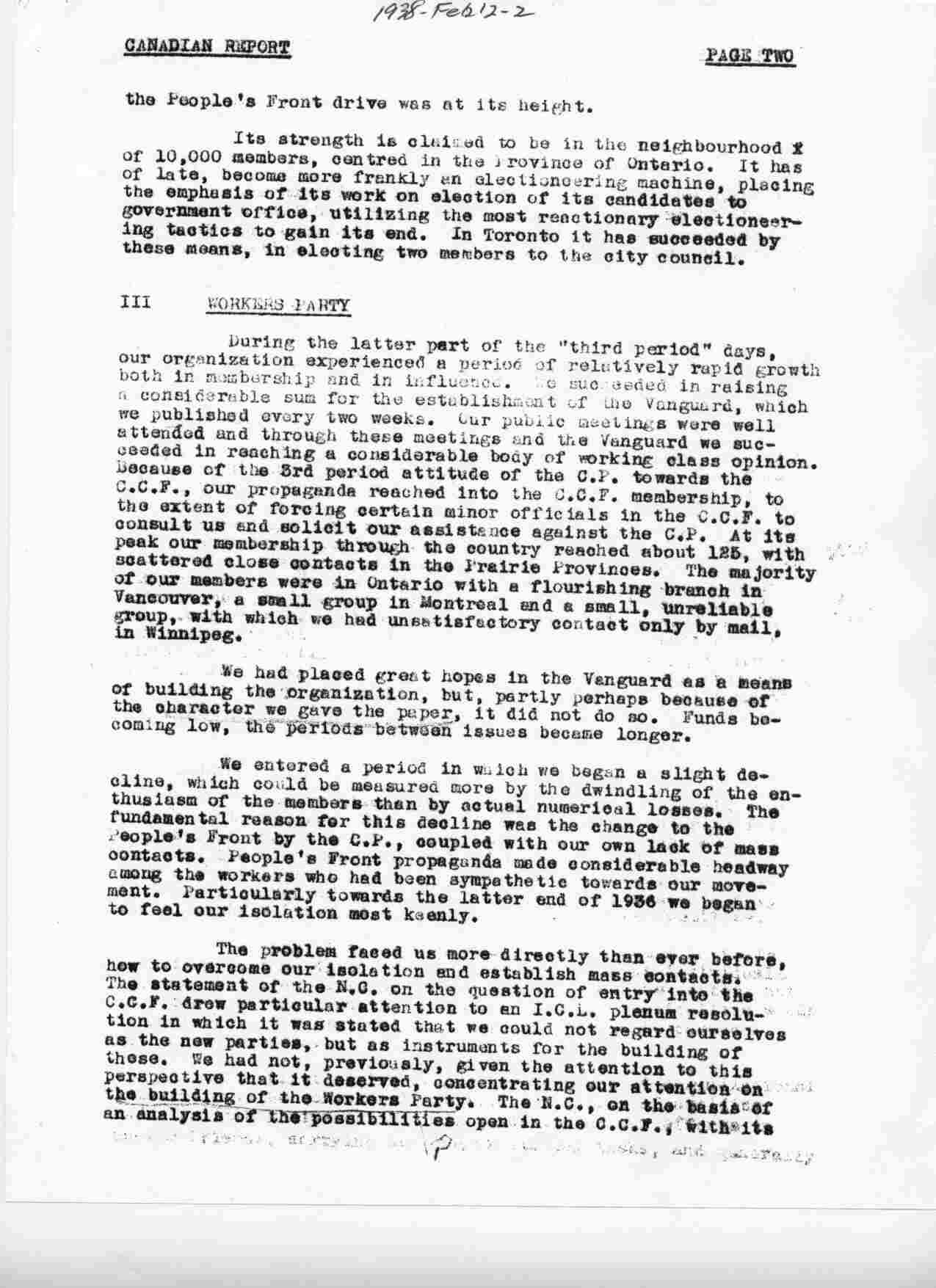 I: C.C.F; II: C.P page 1 | CP Continued, Canadian Report page 2 | III | Worker’s Party page 3 | IV: | Youth, V: Entry page 4 |