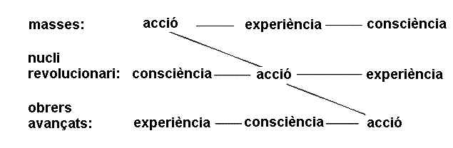 De l'esquema mandelià d'acord amb el qual les masses, l'avantguarda i el partit, segueixen diferents i difícils camins per arribar a la consciència, a l'acció o a l'experiència, ja hem eliminada l'avantguarda, ja que en tractar-se d'un fenomen el seu desenvolupament no pot seguir cap seqüència previsible. Tan sols caldria afegir-hi que, alhora que acompleix el seu paper d'avantguarda, qualsevol sector segueix en aquest moment les mateixes lleis de desenvolupament que el propi moviment de masses i el partit, tot i que de forma contradictòria. Pels marxistes, «l'espontani és la forma embrionària de ço conscient. És a dir que acció, experiència i consciència són parts d'una totalitat que s'hi dóna a tots els nivells, des del partit fins les masses. L'element determinat d'aquesta totalitat són les accions del moviment de masses.
