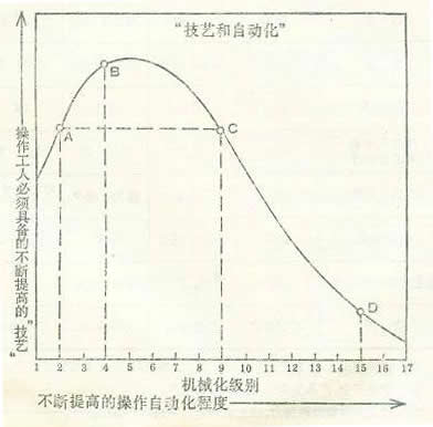 布赖特得出结论说,机械化处于一级至四级时,工具完全由工人控制,因此,工人的技艺水平是上升的(见表⒉、图⒈,布赖特所制图表)。五级至八级:虽然采用机械控制,但仍要依靠工人,所以有些技艺水平上升,但是许多技艺水平下降,按照布赖特的看法,结果是总的技艺要求全面下降。九级至十一级:机器处于外部控制之下,至少达到能给它自己所需要的控制发出信号的程度,所以大多数技艺水平是下降的。最后,机械化水平处于最高的六个等级时,其特征是机器自动更改其动作,因此符合先进的自动生产方法,这时,布赖特所采用的每一个技艺指标,从知识和经验直到做出决定,都急剧下降。“工人的贡献”一栏中的指标不是“减少到零”,就干脆是“零”(只有“责任”和“教育”两项是含糊不清的例外)。(33)布赖特用曲线把结果概括表示出来,称之为“技艺条件的驼峰”(见布赖特所作“技艺和自动化”曲线)。(34)这条曲线说明“机械化程度提高过程中的一般体验”,并且表明,技艺条件只是在头四级时上升,从第五级就开始下降,并随着与“自动化”这一流行术语有关的机械化元件的装置,急剧地下降到最低层。布赖特把他的看法概述如下: