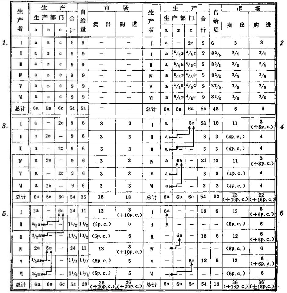 当然,说积累“不依赖”消费品的生产是不行的,因为要扩大生产就需要新的可变资本,因而也就需要消费品;大概作者不过是想用这种说法来强调该公式的一个特点,即Ⅰc(第Ⅰ部类的不变资本)进行再生产时是不和第Ⅱ部类交换的,比如说,社会上每年有一部分煤是为采煤而生产的。当然,这种生产(为采煤而生产煤)通过随后的一系列交换还会与消费品生产发生联系,否则煤矿主和他们的工人都会无法生存。作者在另一处就讲得更差了。他说:“资本主义积累的主要运动的进行,现在和过去(最早时期除外)都不依赖任何直接生产者,不依赖任何居民阶层的个人消费。”(第8页)这里仅仅是指出在资本主义的历史发展中生产资料的生产比消费品的生产占优势。这种说法又被重复了一遍:“如果从一方面说,对于资本主义社会,典型的是为积累而积累,是生产消费而不是个人消费,那么从另一方面说,对于它,典型的正是为生产资料而生产生产资料。”(第21页第2段)假如作者想用这些话来说明资本主义社会不同于以往其他经济组织的地方,就在于机器及其所需物品(煤、铁等)的生产得到发展,那么这完全是对的。就技术水平说,资本主义社会超过了所有其他社会,而技术进步正表现于人力劳动与机器劳动相比日益退居次要地位。 因此,与其批判作者表达得不够清楚的说法,倒不如直接请教马克思,看看能否从他的理论中得出第Ⅰ部类比第Ⅱ部类占“优势”的结论,看看这一优势究竟应当如何理解。 从上面所引的马克思的公式根本不能得出第Ⅰ部类比第Ⅱ部类占优势的结论,因为这两个部类在这里是平行发展的。可是这个公式没有考虑的正是技术进步。如马克思在《资本论》第1卷中所证明的,技术进步表现于可变资本与不变资本的比值(V/c)逐渐缩小,而在这个公式中却是把这个比值当作不变的。 显而易见,如果把这种变化纳入公式中,那一定是生产资料比消费品增长得快。可是我还是觉得,第一为了明显起见,第二为了防止可能由这个前提得出不正确的结论,把这种计算列出来并不是多余的。 [下表中的积累率是当作不变的:额外价值的一半用于积累,一半供个人消费。] [也可以略过下面的公式而直接看下一页上由它得出的结论。字母ò代表用来扩大生产的追加资本,即额外价值的积累部分。] 第一年: Ⅰ4000c+1000v+1000m=6000……v:(c+v)=20.0% Ⅱ1500c+ 750v+ 750m=3000……v:(c+v)=33.3% Ⅰ(1000v+500m)=Ⅱ1500c. Д.Ⅰ500m=450c+50v…………v:(c+v)=1/10 ![]() Д.Ⅱ60m= 50c+10v…………v:(c+v)=1/6 Ⅰ4450c+1050v+(500m)=6000 Ⅱ1550c+ 760v+(690m)=3000 第二年: Ⅰ4450c+1050v+1050m=6550……v:(c+v)=19.2% Ⅱ1550c+ 760v+ 760m=3070……v:(c+v)=32.9% Ⅰ(1050v+525m)=Ⅱ1575c Ⅱ(1550c+25m). ![]() Д.Ⅱ 28m=25c+ 3v…………v:(c+v)=约1/9 Д.Ⅰ525m=500c+25v…………v:(c+v)=约1/21 ![]() Д.Ⅱ 28m=25c+ 3v…………v:(c+v)=约1/9 Ⅰ4950c+1075v+(525m)=6550 Ⅱ1602c+ 766v+(702m)=3070 第三年: Ⅰ4950c+1075v+1075m=7100……v:(c+v)=17.8% Ⅱ1602c+ 766v+ 766m=3134……v:(c+v)=32.3% Ⅰ(1075v+537½m)=Ⅱ1612½c Ⅱ(1602c+10½m) ![]() Д.Ⅱ 11½m= 10½c+ 1v……v:(c+v)=约1/12. Д.Ⅰ537½m=517½c+20v……v:(c+v)=约1/26. ![]() Д.Ⅱ 22m=20c+2v…………v:(c+v)=111 Ⅰ5467½c+1095v+(537½m)=7100 Ⅱ1634½c+ 769v+(730½m)=3134 第四年: Ⅰ5467½c+1095v+1095m=7657½…v:(c+v)=16.7% Ⅱ1634½c+ 769v+ 769m=3172½…v:(c+v)=32.0% 余类推。 现在我们把这个公式中关于社会产品各部分增长情形的结论比较一下[20]: