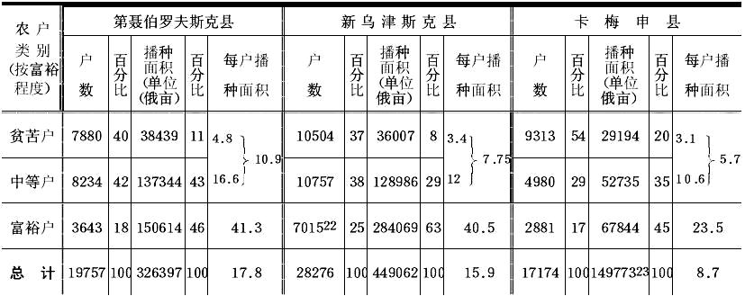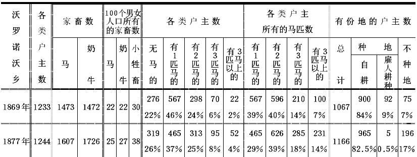 为了证实这一点,作者利用了莫斯科地方自治局统计中的一些资料,现在我把这些资料列成下表[注:我省略了关于奶牛分配的资料(结论一样),加上了百分比。]:![]() 作者继续说:“这些数字雄辩地说明,该乡马、奶牛和小牲畜的总数增加了,但这种财富的增加只属于某些人,即属于有马2—3匹以上的户主……