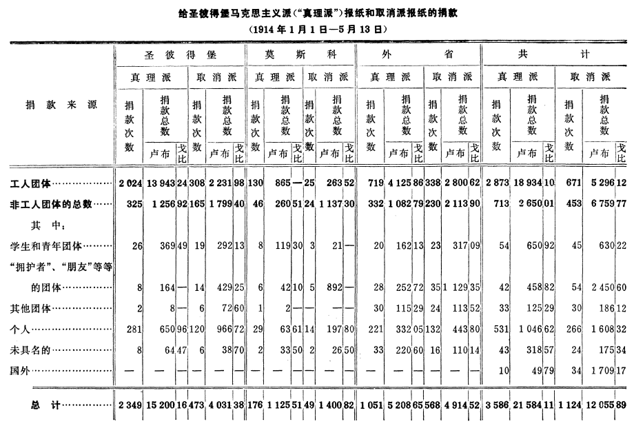 中文马克思主义文库 -> 列宁 -> 《列宁全集》 -> 第25卷 工人阶级和工人报刊 (1914年6月13日和14日〔26日和27日〕) 对于觉悟的工人来说,再没有比了解和正确地认识工人运动的意义更为重要的任务了。工人运动的唯一的,也是不可战胜的力量源泉,就是工人的觉悟以及工人斗争的广泛性,也就是说,有大批雇佣工人参加这个斗争。 已经办了几年的圣彼得堡马克思主义报刊提供了唯一的、卓越的、无可替代的、经得起任何人检查的说明工人运动广泛性和哪种派别在工人运动中占优势的材料。只有那些想隐瞒真相的人才会象自由派和取消派那样回避这种材料。 说明1914年1月1日—5月13日给圣彼得堡“真理派”(马克思主义派)的报纸和取消派的报纸的捐款情形的完整材料,已经由维·亚·吉·同志整理出来了。现在我们把他编制的表格全部刊印出来,而在正文里,为了不让数字过分地麻烦读者,我们有时只引用整数。 这就是维·亚·吉·同志所编制的表格。 ![]() 首先我们要谈谈工人团体的数目。这些数字是“真理派”和“取消派”报纸创刊以来的累积总数。工人团体的数目如下:
