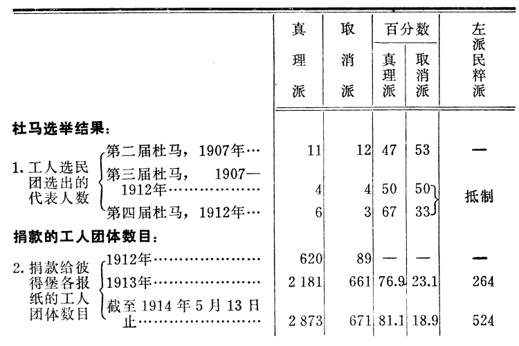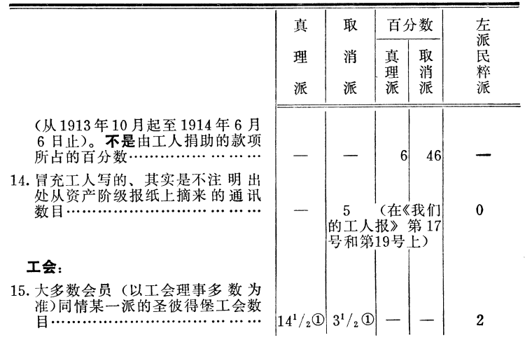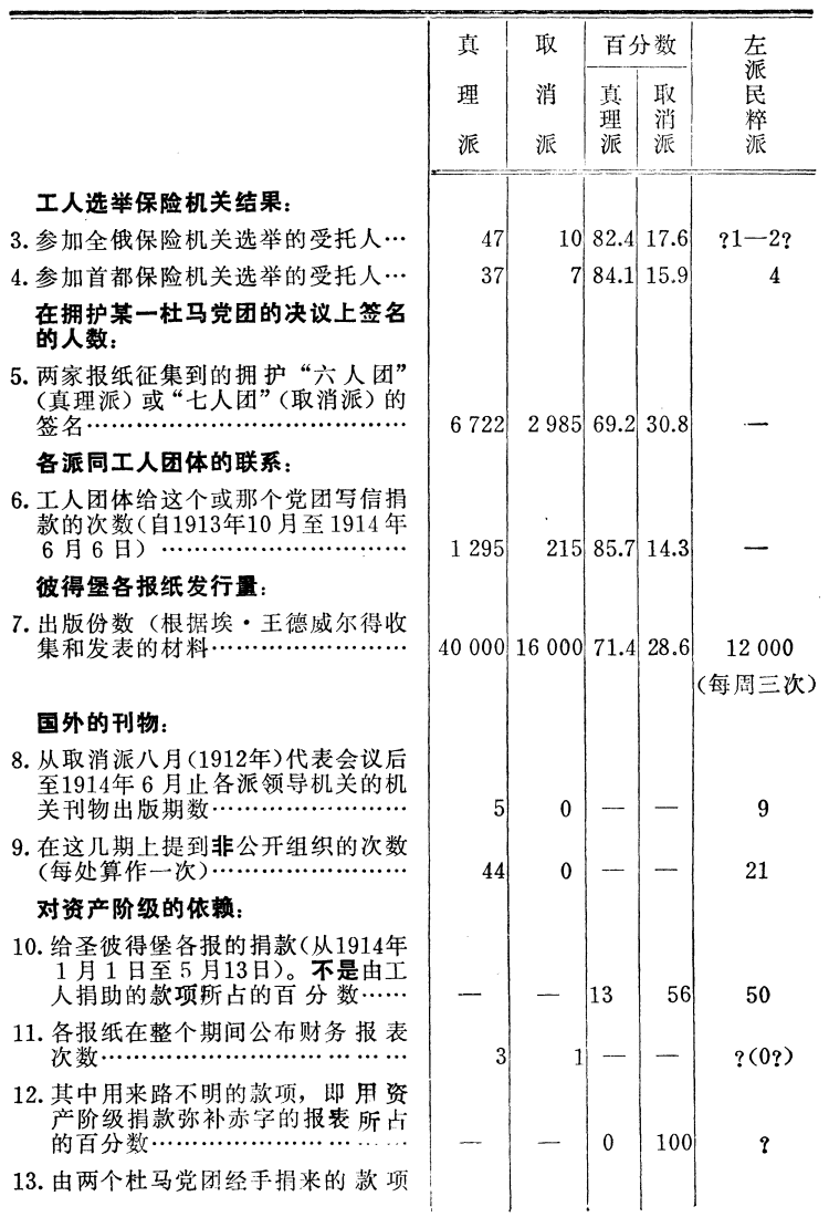 中文马克思主义文库 -> 列宁 -> 《列宁全集》 -> 第25卷 表明工人运动中各派力量的一些客观材料[166] (1914年6月26日〔7月9日〕) 觉悟工人的最重要任务,是认识本阶级的运动,认识运动的实质、目的和任务,以及运动的条件和实际形式。这是因为工人运动的全部力量就在于它的觉悟性和群众性:资本主义每发展一步,都使无产者即雇佣工人的数量增加,并且团结他们,组织他们,教育他们,从而造成一支必然要奔向自己目标的阶级力量。 报刊上经常解释的马克思主义者的纲领和策略决议,有助于工人群众认识运动的实质、目的和任务。 俄国工人运动中各派之间的斗争是有深刻的阶级根源的。在俄国工人运动中,同马克思主义派(真理派)作斗争的有两“派”(就其群众性和历史根源来说)可以称得上“派别”,那就是民粹派和取消派,两者都体现了资产阶级对无产阶级的影响。这一点马克思主义者已经解释过许多次,并且在马克思主义者关于民粹派(同他们斗争已经有30年了)和取消派(它也有将近20年的历史,因为取消主义是“经济主义”和孟什维主义的直接继续)的许多决议中已经加以肯定了。 目前,表明俄国工人运动中各派力量的客观材料积累得愈来愈多了。我们应该尽一切力量收集、核对和研究这些客观材料,这些材料涉及的不是某些个人和集团的行为和情绪,而是群众的行为和情绪,这些材料来自各种怀有敌意的报纸,每一个识字的人都可以核对。 只有根据这样的材料,才能学习和研究本阶级的运动。民粹派和取消派以及各种知识分子小集团,如“前进派”、普列汉诺夫派、托洛茨基派,它们的一个主要缺点,甚至可说是最主要的缺点(或者说对工人阶级犯下的罪过)就是主观主义。他们处处都把自己的愿望、自己的“意见”、自己的估计、自己的“打算”当作工人的意志,当作工人运动的要求。比如,他们讲到“统一”时,却目空一切地无视俄国大多数觉悟工人自1912年初至1914年中这两年半来建立 真正统一的经验。 现在我们将有关工人运动中各派力量的客观材料汇总列表如下。愿意相信主观估计和种种诺言的人可以去找各种“小集团”,我们的材料是只请那些希望研究客观事实的人看的。事实如下: ![]() ![]() ![]() [注:有一个工会,同情真理派和同情取消派的人数相等。] 我们先把上面的材料简略说明一下,然后再作结论。 最方便的办法是逐条说明。第1条。关于复选代表和受托人的材料现在没有。谁要是对利用“选民团”的材料表示不满,那他简直可笑,因为别的材料根本就没有。德国社会民主党是按排斥妇女、形成“男子”选民团的俾斯麦选举法来衡量他们的成绩的。 第2条。不仅“在决议上匆忙签名”而且真正捐款的工人团体有多少,这不仅是表明某派力量的最正确最可靠的标志,而且是表明组织程度即党性的最正确最可靠的标志。 正因为如此,取消派和各个“小集团”都表露出他们主观上对这种标志的厌恶。 取消派分子反驳说:我们还有犹太人和格鲁吉亚人的报纸,而《真理报》就只此一家。这种说法不对。第一,爱沙尼亚人和立陶宛人的报纸也是真理派的报纸[167]。第二,拿地方上来讲,难道可以把莫斯科忘掉吗?莫斯科的工人报纸[168]在1913年团结和联合了390个工人团体(《工人日报》[169]第1号第19页),而犹太人的《时报》从第2号(1912年12月29日)开始到1914年6月1日为止只联合了296个工人团体(其中有190个是在1914年3月20日以前联合的,有106个是在1914年3月20日至6月1日这段时期联合的)。可见,仅莫斯科一地就“抵得上”取消派主观地拿来作例证的《时报》,而且还绰绰有余! 我们请格鲁吉亚和亚美尼亚的同志收集有关高加索取消派报纸的材料。那里究竟有多少工人团体?需要有全面的客观材料。 工人团体数的计算可能有错误,但也只能是局部性的错误。我们请大家都来核对和更正。 第3条和第4条是无需说明的。最好是进行一次调查,来收集地方的新材料。 第5条。在2985个取消派分子签名中,包括了1086个崩得分子和719个高加索人。我们希望当地的同志能核对这些数字。 第6条。两个党团的司库都印发党团收到的各种捐款总额的报表。这是衡量和工人联系的精确的客观标志。 第7条。报纸的发行量。这些材料是由埃·王德威尔得收集和发表的,可是取消派和自由派(《基辅思想报》)却把这些材料隐瞒了起来。这就是“主观主义”。最好能收集到至少一个月的更完备的材料。 第8条和第9条。这是表明取消派背弃“地下组织”,即背弃党的一个客观例证。但是在国外,从1914年1月1日起至5月13日止,真理派一共收到捐款49卢布79戈比(0.25%),取消派却收到了1709卢布17戈比(14%)。不要说“我不能”,而要说“我不想”! 第10—14条。这些客观的标志说明了取消派和民粹派对资产阶级的依赖,说明了他们的资产阶级性质。在主观上,取消派和民粹派是“社会主义者”和“社会民主主义者”。在客观上,无论按他们的思想内容,或群众运动的经验,它们都是资产阶级知识分子的集团,都是极力使少数工人脱离工人政党的集团。 请读者特别注意取消派伪造工人通讯的事实。这真是空前的骇人听闻的骗局!希望各地的马克思主义者都来揭穿这种欺骗,收集这方面的客观材料(见1914年6月11日《劳动的真理报》第12号[170])。 第15条。这项材料特别重要,最好是进行一次专门的调查来