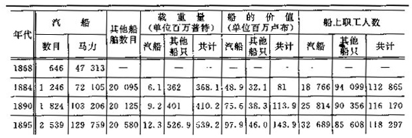 俄国的商船队在1868年有汽船51艘,装载量为14300拉斯特( ①注:拉斯特是俄国在20世纪初以前使用的商船容量单位,等于5.663立方米,重量约为两吨。--编者注),又有帆船700艘,装载量为41800拉斯特,而在1896年则有汽船522艘,装载量为161600拉斯特( ②注:《军事统计汇编》第758页和《财政部年鉴》第1编第363页。《俄国的生产力》第17编第30页。)