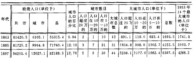 我们所考察的这一过程的最明显的表现,就是城市的增加。改革后时代欧俄(50个省)城市增加的资料如下( ①注:1863年的数字,引自《俄罗斯帝国统计年鉴》(1866年版第1卷)和《军事统计汇编》。奥伦堡省与乌法省城市人口的数字,是依据城市表改正过的。因此,我国城市人口总计为6105100人,而不是《军事统计汇编》所说的6087100人。1885年的资料,引自《1884-1885年度俄国资料汇集》。1897年的数字,引自1897年1月28日的人口调查(中央统计委员会出版的《1897年俄罗斯帝国第一次人口普查》1897年和1898年圣彼得堡版第1编和第2编)。根据1897年的人口调查,城市的常住人口为11830500人,即12.55%。我们采取的是城市现有人口。应该指出:不能担保1863、1885、1897各年资料是完全同类的和可比的。因此,我们只限于比较最一般的关系并把大城市的资料划分出来。)◎第200页◎