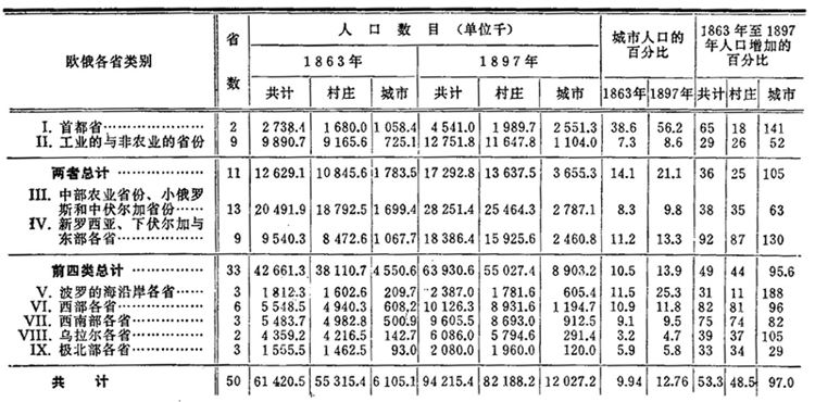 改革后的俄国向我们展现的,正是这两种过程的同时出现。在改革后时代初期,即在60年代,欧俄南部与东部边疆地区是人烟相当稀少的地区,因而俄国中部农业区域的人口就像巨流般地向这里移来。新的土地上新的农业人口的形成,在某种程度内也掩盖了与之平行进行的人口由农业向工业的转移。为了根据城市人口的资料来清楚地说明俄国的这种特点,必须把欧俄的50个省分成几个类别。我们举出1863年和1897年欧俄9个地区的城市人口的资料。( ①注:见本卷第205页。--编者注)