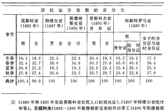 当然,外出做非农业零工的工人,有一部分登记在城市现有人口人数之内,或包括在上述非城市工业中心的人口之内。但只是一部分而已,因为这种人口具有流动性质,各个中心的人口调查很难把他们计算进去;其次,人口普查一般在冬季进行,而大部分手工业工人是在春季离开家庭。下面就是外出做非农业零工的一些主要省份的这方面的资料( ①注:《1880年和1885年发给莫斯科省农民人口的居民证》。《1897年特维尔省统计年鉴》。日班科夫《1892-1895年斯摩棱斯克省的外出零工》1896年斯摩棱斯克版。日班科夫《1866-1883年的资料说明外出谋生对科斯特罗马省人口迁徙的影响》1887年科斯特罗马版。《普斯科夫省农民的副业》1898年普斯科夫版。莫斯科省百分比的错误,未能加以改正,因为没有绝对数字。科斯特罗马省只有各县的资料,而且只是百分比,因此我们不得不取各县的平均数,于是我们也就把科斯特罗马省的资料单独列出来。根据计算,雅罗斯拉夫尔省的外出工业者中间,全年离家的有68.7%;秋冬两季离家的有12.6%;春夏两季离家的有18.7%。必须指出,雅罗斯拉夫尔省的资料(《雅罗斯拉夫尔省概述》1896年雅罗斯拉夫尔版第2编)是不能与前面的资料比较的,因为它们是根据神父等等的陈述,而不是根据关于身分证的资料。)