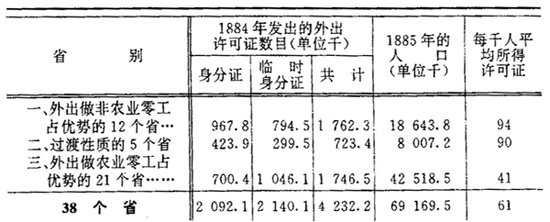 “这些数字表明,外出做零工在第一类中比在第三类中发展得厉害些…… 其次,从所引用的数字可以看出,随着所属的类别的不同,外出谋生的期间也各异。外出做非农业零工占优势的地方,外出的期间就长得多。”(1886年《事业》第7期第134页)