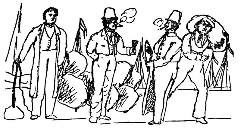 这里可以看到一个会战的场面,也就是街头即景,这是威悉河畔的一条沿岸大街,货物就卸在这里。拿鞭子的小伙子是马车夫,他马上要装运堆放在后面的一袋袋咖啡豆。右边扛袋子的小伙子是脚夫,正在搬运咖啡豆。脚夫旁边是酿酒师,刚刚取了样品,拿在手上;酿酒师旁边是船夫,咖啡豆就是从他船上卸下的。你无法否认,这些人都十分有趣。马车夫赶车时,他骑在一匹没有马鞍、马镫和马刺的马背上,一直把他双脚的后跟紧紧夹住马的肋骨,象这样: