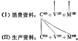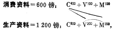 中文马克思主义文库 -> 马克思 - 恩格斯 -> 《马克思恩格斯全集》 -> 第五十卷 第三章 流通过程和再生产过程的现实条件 [再论规模不变的再生产][155]本节的全部论述,可以从适用于单个资本的商品产品的公式中直接引申出来。 假定在某种商品如棉纱的生产中,消费掉价值1200镑的生产资料和价值300镑的劳动力。再假定剥削率为100%。那么,按照第一卷中所作的价值分析,产品价值分解为c+v+m,或在这里的具体场合分解为1200c+300v+300m,或者也可以说分解为 ![]() 现在把这个公式用于社会的全部年产品,并且这里的几百可以看作几百万。其次,我们再假定,不变资本、可变资本和剩余价值之间的比例不变。这样,社会年产品价值等于1200c+300v+300m,或C1200+V300+M300。 这一产品部分地由消费资料组成,部分地由生产资料组成。 假定进行的是简单再生产,从而假定,无论是工人作为工资所得的部分,还是资本家作为剩余价值所得的部分,都进入消费基金。 首先很清楚,根据这一假定,600镑产品价值(=V300+M300)用于个人消费,也就是说,由消费资料组成的产品部分,按其价值来看应当等于600镑=V300+M300。 因此,这些消费资料的价值等于全年的价值产品,也就是说, ![]() ![]() 但是,虽然这些消费资料的价值等于600,即全年的价值产品,可是由此决不能反过来说,在这些消费资料中实现了一年中追加的全部劳动,也就是说,它们作为产品的价值,600镑,实际上是一年中重新创造的600镑价值产品。 无论是消费资料的价值,或者是生产资料的价值,——而社会总产品就由这两种商品组成(同一种商品既可以用作消费资料,也可以用作其他商品的生产资料,而不管这些商品是生产资料还是消费资料;但整个说来,两种商品不仅在职能上,而且在实物形式上都有所区别,而且对于我们当前的目的来说,这种划分可能是绝对的分界线),——这种价值部分地是由生产它们时所消费的生产资料(生产材料和劳动资料)的再现的价值组成,后者被生产产品时所使用的劳动转移到产品上去;部分地是由新价值组成,这一新价值等于所使用的劳动力的价值加上这一劳动所生产的剩余价值。 因此,等于600镑的消费资料的价值,是应分解为c+v+m的产品价值。假定生产这种产品时所消费的生产资料的价值等于400镑,所使用的劳动力的价值等于100镑,这一产品价值中所包含的剩余价值等于100镑(因为我们假定剥削率等于100%)。 于是,我们得出: