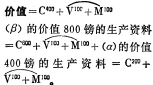 但是,(Ⅱ)的全部商品量包括: (α)作为生产材料和劳动资料直接进入生活资料生产的生产资料; (β)生产(α)的生产资料所必需的生产资料。 在生产(α)的生产资料时,消费了一定量(β)的生产资料,而且这个量应当从社会年产品中得到补偿。诚然,Ⅱ(α)和Ⅱ(β)的一部分生产资料可以具有同样的实物形式,也就是说,可以用作消费资料的生产资料,也可以用作自身的或其他生产资料的生产资料。但是,(α)的生产资料和(β)的生产资料有很大一部分在实物形式上是有区别的,而且为了简便起见,我们在这里可以假定,这种区别带有绝对性质,并把这两个类别严格区分开来。也就是说,它们也是不同种劳动的产品;或者说,一年中加进Ⅱ的那部分社会劳动,以一种实物形式消费在Ⅱ(α)的生产中,而以另一种实物形式消费在Ⅱ(β)的生产中。换句话说,V200+M200不能成为加进Ⅱ的全部劳动的价值产品,而C800只能是再现的不变资本价值。 总之,假定在等于400镑的Ⅱ(α)的产品中,资本的不变部分等于200镑,而新加进的价值为200镑,其中包括100v和100m。 或Ⅱ(α)的产品: