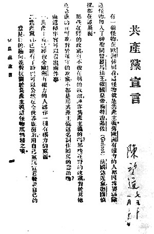 錄入者注:本書依照2011年北京大學對1920年8月陳望道譯本第一版的影印本錄入。繁體字版本基本依全書原貌進行錄入,文字和標點運用均仍其舊,因此可以看到文字運用的似乎不統一。某些實在無法依原貌進行錄入的文字(異體字),只能採用正常繁體字代替,但均是同一文字。原書中由於排版失誤而導致的文字、標點及其排列的錯誤在簡體和繁體版本中均予以糾正,錯誤的原貌以章節附註形式保留于文末。此書第一版封面曾將《共產黨宣言》誤排為《共黨產宣言》(如圖),之後的再版都已改正。