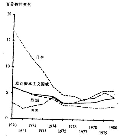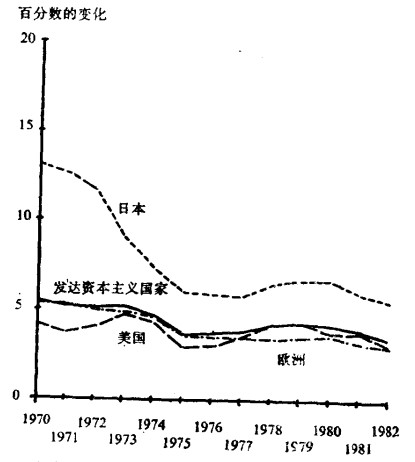 但是,美国的经济既没有倒退到与日本相等的地位,也没有恢复它原先与欧洲相处时的有利地位。首先,美国的就业上升得很迅速:在1973年到1981年间制造业的就业年增长0.4%,而日本制造业的就业年下降0.3%,在欧洲则为年下降1.7%。所以,作为机械化指标的工人人均资本存货,在日本增加了约6%,欧洲为5%,美国则为4%。不过这个差别比过去的年份里要小得多(而且由于有这样一个事实,即:欧洲和日本的旧设备磨损速度较快,这一点没有在资本存货的统计中得到反映,因此,这种差别可能被夸大了)。