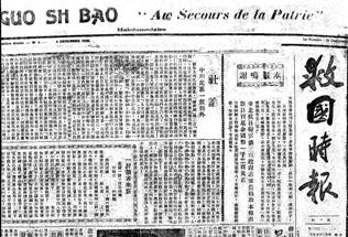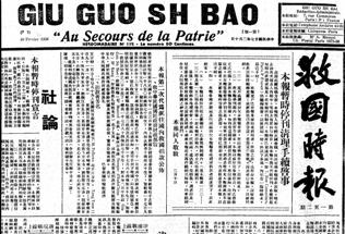 20世纪30年代中国共产党在国外创办的机关报。1935年12月9日在法国巴黎创刊。前身是这年5月15日在巴黎创刊的《救国报》。编辑部设在莫斯科,由共产国际中国共产党代表团领导。廖焕星、李立三、陈潭秋等先后任主编。印刷所和发行部设在巴黎,先后由吴玉章、吴克坚等负责。以海外华侨为主要对象。着重宣传中国共产党建立民族统一战线的政治主张,经常刊登中共国央主件(“国央主件”疑系“中央文件”之误——抄录者)和毛泽东、斯大林的著作,报道国内抗日救亡运动和抗日民主根据地的情况等。初为对开一张,周刊,后改为5日刊、3日刊。发行量初为5000份,后增至2万份。发行43个国家。在国内曾行销北平、上海、天津、武汉、西安等城市,在四川、新疆等地也有读者。1938年2月10日出至第152期后,迁到美国纽约与中国共产党领导的《先锋报》合并,仍以《救国时报》名称出版。后因工作人员回国参加抗日战争,宣布停刊。 ——载《中国近现代史大典》下册第651页。 (中国近现代史大典编委会编,中共党史出版社1992年6月第一版。) |