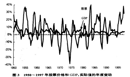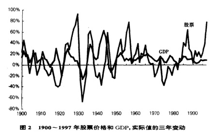 图2 1900~1997年股票价格和GDP,实际值的三年变动