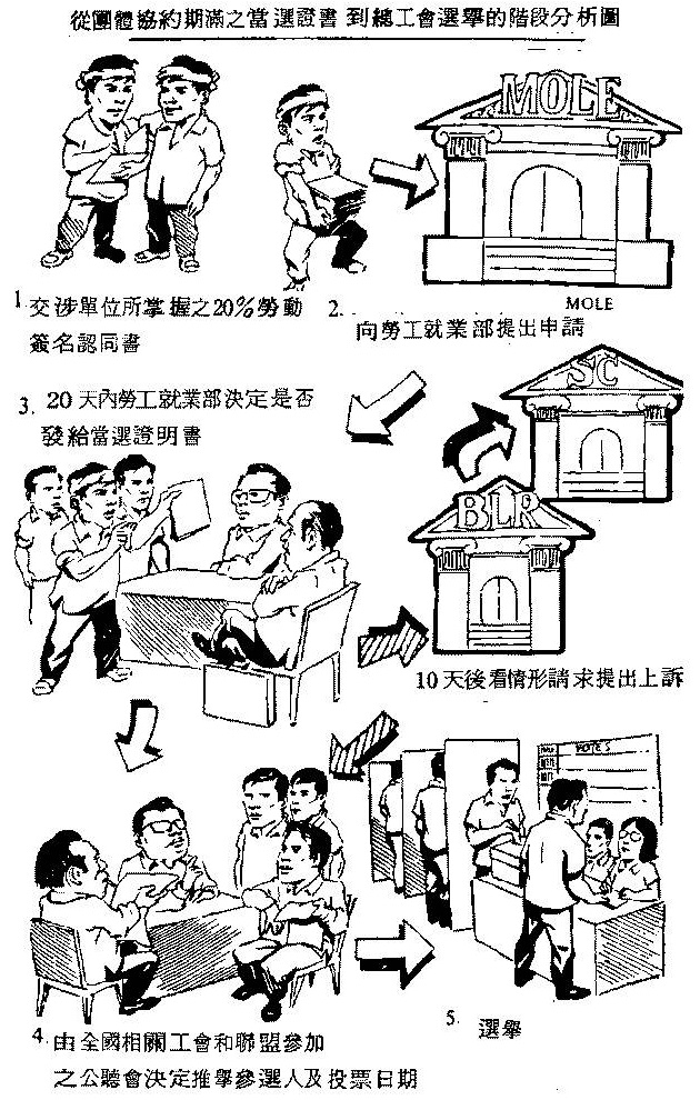 另外,可以从政府机关得到其它资讯,例如安全交流协会(SEC)和劳工就业部(MOLE)。有实例显示,在工会发起人与人事管理人员关系良好的情况下,可以经由这种帮助而获得一些重要的文件。当然,工会发起人在工厂里不要轻易曝光,以免引起管理阶层或资本家起疑。