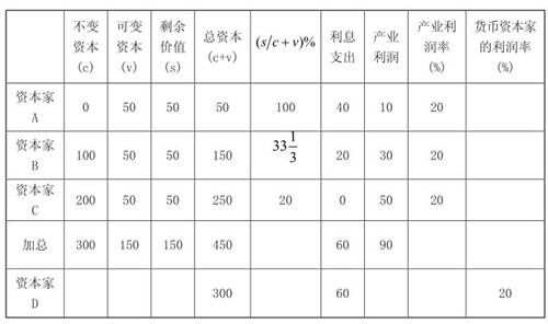 沃尔弗的数字例子见表2.1中。在表中,资本II的资本有机构成较高,劳动生产率较高,剩余价值更多,剥削率也较高,并和资本I有着相同的利润率,对它们来说,相反的情况也一样。商品的价值仍然取决于物化在它们中的劳动数量。沃尔弗认为“价值规律并没有被破坏”,在马克思那里不存在自相矛盾的地方。“恰恰相反,它(解决方法)提供了一个新的证据,证明马克思对于资本主义经济的批判体系,是深刻且富有远见的”沃尔弗的结论声称整个问题是个伪命题,这一混乱部分地是由恩格斯造成的,恩格斯试图使先前解决这一问题的尝试都无效,并(沃尔弗隐晦地暗示)推迟了《资本论》第三卷的出版。无论如何,和斯蒂贝林一样,沃尔弗是回避而不是解决这个问题。![]() 〔注:资本II的剥削率应为30。中文版有误。——中文马克思主义文库〕 来源:沃尔弗,‘Das Ratsel der Durchschnittsprofitrate bei Marx', Jahrbucher fur Nationalokonomie und Statistik,57,1891,第358页。意大利学者阿基尔·洛里亚的参赛作品缺乏实质性内容,对他的关注只是因为恩格斯对他作出了尖刻的回应。1884年,洛里亚把利润率相等和有机构成不等之间无法解决的矛盾,视为整个马克思理论体系的重大缺陷。但是,到了1890年,在对施米特的著作进行评论时,他提出了自己解决问题的方法,我们可以认为他是打算认真地解决这个问题的。表2.2对洛里亚的解决方法作了概括。三个产业资本家(A、B和C)有着不同的资本有机构成和相同的剥削率,在不存在非产业资本介入的情况下,他们将有不同的利润率。存在借贷资本家时,他们把剩余价值的一部分用于支付货币资本家D的利息。自己留下的产业利润与他们使用的资本量成比例。从而形成了统一的产业利润率,而且这个利润率和货币资本家D的利润率相同。 洛里亚没有对他自己奇怪的假设进行任何合理的说明,这个假设认为产业资本家A、B、C支付的利息反过来和他们使用的资本数量成比例。正如恩格斯在他的批评中提到的,通过把资本家D看作是索取李嘉图的级差地租的地主,而不是索取利息的货币资本家,也许可以从洛里亚的例子中挽救出某些有用的内容。但是,这并不是洛里亚的观点,从洛里亚的例子中不可能得到一个一般性的解决方法,因为在没有地租支付的情况下它就不适用了。 ![]() 更有意义的的贡献来自彼·法尔曼,施米特称其为“优秀的小伙子、移居美国的俄国犹太人、职业化学家”。和许多同时代的俄国人一样,法尔曼受到李嘉图理论的强烈影响。他区分了商品价格中的两个因素:由物化在商品中的劳动数量决定的商品价值的“构成因素”,以及代表资本家和地主对产品份额索取权的“分配因素”。法尔曼主张,由于社会财富是由人们生产的商品中所包含的人类劳动的总量构成的,因此,总的来说,价值必须等于价格:“两种商品相交换时,一种商品的价格高于它的价值的大小,必然等于另一种商品的价格低于它的价值的大小,反之亦然”,价格和价值之间差异的产生是分配因素造成的。法尔曼驳斥了施米特的解决方法,认为施米特的方法是非马克思主义的,因为施米特的解决方法拒绝把价值规律应用于剩余产品。他也反对沃尔弗的结论,因为沃尔弗认为价值量会随着劳动生产率的提高而增加,这和马克思的观点是矛盾的。法尔曼非常清楚地说明了每个部门的价格、价值和资本有机构成之间的关系: 如果利润是剩余价值的表现形式,怎么能够认为在剩余价值量取决于工人数量的同时,利润量似乎是独立于工人的数量的呢?仅仅因为,投资在生产资料上的资本和投资在工资上的资本之间的比率(或者像马克思说的那样,不变和可变资本之间的比率c:v)最大的产业部门,其商品以高于它们价值的价格出售,这意味着,不变资本和可变资本的比率最小的产业部门,其商品以低于它们价值的价格出售,c:v的大小代表着明确的平均水平时,商品才按照它们的实际价值出售。