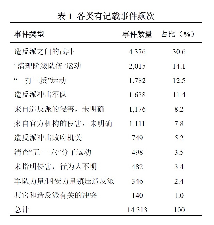 表1给出了“重复发生”事件的频率分布。被记载最多的事件是造反派势力之间的武斗,占总数的30.6%。超过半数的有记载事件和造反派活动有关——冲击军队(占总数11.4%),针对个人和团体的侵害(占总数8.2%),冲击政府机关(占总数5.2%)。总的来讲,地方志记载的事件中,有56.4%和造反派的活动有关。官方叙事强调群众造反的破坏性,而地方志记录中造反派活动占比很高,这证明了这一点。