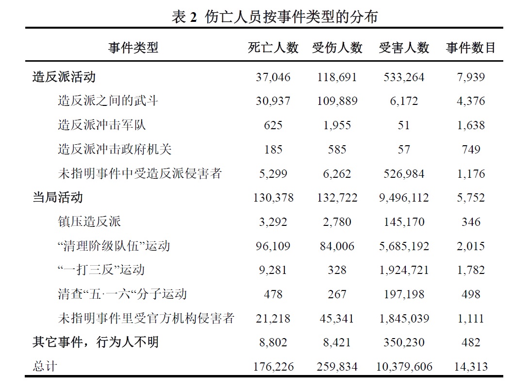 最后的比较是定性的:造成这些伤亡的活动在不同的案例中差异很大。文化大革命经历了三个不同的阶段:第一阶段,日益增长的造反活动针对因过去的表现而在政治上被污名化的人和地方机关与政府领导人;第二阶段,文官政府力量崩溃后,武装派系之间为争夺权力而发生暴力冲突;第三,国家进行一系列严厉的镇压运动。我们还注意到,绝大多数伤亡——估计约有四分之三——是在第三阶段由当局的行动造成的。其余的绝大多数是1967年和1968年不同造反派系之间的武装冲突造成的。危害最小的阶段是大规模造反的初期。对于在这些迫害中首当其冲的家庭和官员来说,这一段经历是很痛苦的,然而因这一阶段的动荡而死亡的人数相对来说还是很少。