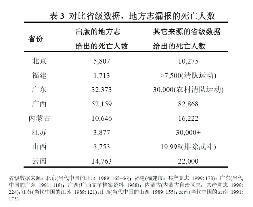 这些对比只能说明部分的真相。中国的其他机构发布的省级数据记载的死亡人数比地方志中的死亡人数高得多,即便对于那些在地方志中报告了相对较高的死亡数字的省份也是如此。我们在表3中单独给出了一些省份的数据,用来说明这一问题。其它来源给出的山西和江苏的数字是地方志中的五到八倍。广西的地方志记载了目前最大的死亡数字(52159人),却也不到党的内部调查中所列举的死亡人数的三分之二(82868人)。