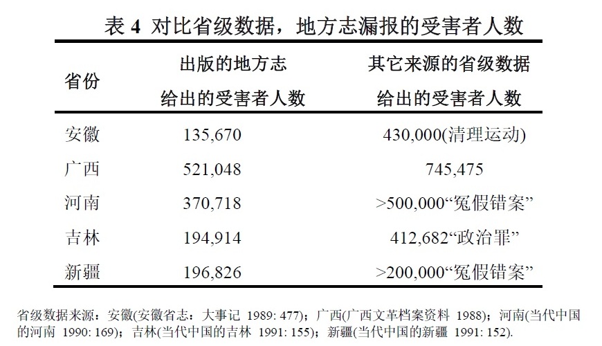 可以肯定的是,与漏报死亡人数一样,一些省份存在系统性地漏报受迫害人数的情况。表4显示出:安徽、吉林和河南的地方志的报告率非常低。然而,许多省份的地方志记载的受迫害人数超过了广西内部报告中的受害人数。云南的150万受迫害者占总人口的6.6%,上海的72.1万受迫害者占6.5%,北京的33.6万受迫害者占4.7%。广西的受迫害者所占总人口比例仅不到3%,少于云南和上海的一半,排在全国的第六位。所有这些都表明:对受迫害人数的记载,比对死亡人数的记载要完全得多。