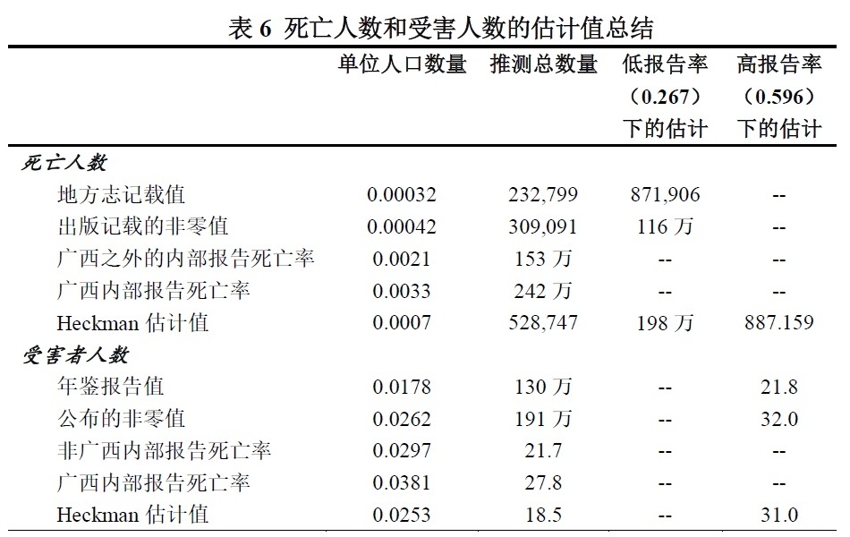 表6展示了死亡人数和受害人数估计值的范围。表的上半部分(第一至第五行)总结了对死亡人数的各种估计。第一行为最低估值,这些估计值采用了地方志记载的原始死亡数据,并仅根据估计的最低报告率对其进行调整。第二行假定所有地方的报告率均为0.267,将所有零死亡人数的记载视为数据遗失,并将所有记载死亡人数非零的地区的死亡率应用于全国人口,得出死亡人数估值为116万。第三行将非广西案例的内部数据的死亡率应用于全国范围,得出的估计值为153万。第四行是一个极端的高估计值,将广西的死亡率应用于全国,得到了242万的估计值。第五行的数字,是我们尽最大努力,对最有可能严重漏报或根本不记载伤亡情况的地方志进行统计调整而得到的。即便是在修正最详尽的地方志的漏报之前,它也已经给出了更高的死亡人数下限:52.8万。这表示:如果地方志的质量都相对较高,那么地方志记载的死亡人数可能至少是52.8万。由于即使是最详尽的地方志也仅仅记载了实际死亡人数的约60%(这个数字在很大程度上基于广西的地方志),88.7万的数字很可能是低估了实际死亡人数;若基于之前假定的地方志报告率0.267进行计算,则将给出198万的死亡人数,这又可能是对漏报的过度修正,因为这个报告率经过了统计调整。根据这些估计和假设,死亡人数可能在110万到160万之间,这个数据采用了第二行第三列的116万的低估计值和第三行第二列的153万的高估计值。我怀疑实际数字更接近这个区间较高的一端,但我们拥有的数据不能确保高置信度。