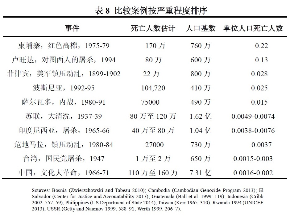累计数字不能反映风险人群的规模。死亡率是用来衡量严重程度的,它与地震的震级不同:死亡率昭示着一个人被杀害的可能性。中国的人口比任何一个比较案例都要多得多。表8将用来比较的案例按严重程度排序,它从根本上改变了我们的观点。按照这个标准,1970年代末的红色高棉和卢旺达1994年的大屠杀是迄今为止最严重的集体杀戮,它们分别造成了22%和13%的基础人口死亡。其次是1899年至1902年美国军队在菲律宾镇压叛乱的行动,导致当地2.8%的人口死于武装冲突或饥饿。这个数字与1992年至1995年波黑战争造成的人口死亡比例相当。其余案例的人口死亡比例则低得多。苏联大清洗和印度尼西亚反共屠杀的估计死亡率大致相当,约为4至7‰. 1980年代初危地马拉镇压叛乱造成的死亡率约为3.7‰. 有意思的是,唯一一个冲击力堪比文化大革命的案例,是国民党在1947年对台湾叛乱的野蛮反扑:在台湾成为日本殖民地相当一段时间后,国民党政权试图重新夺回对台湾的控制。对“二·二八”事件人口死亡率的低估值和我们对文化大革命人口死亡率的低估值大致相同,而高估值则与广西省的数据不相上下。