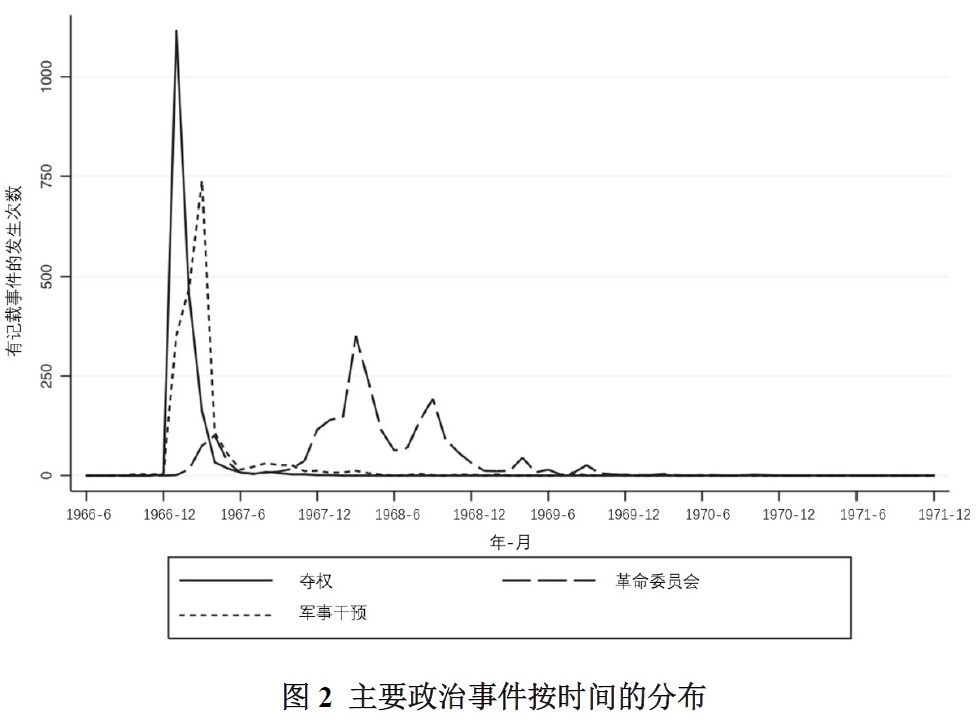 数据库也广泛包括了关于地方性政治事件的信息,其中有15种不同的“一次性”事件(例如第一次提到某红卫兵组织,或第一次提到对立的地方派系)。这些“一次性”事件中最重要的,也是本文接下来要分析的,是造反派对地方政府进行“夺权”的日期(2,213个行政区里有1801个发生了夺权),军队力量第一次介入地方的日期(1,924个行政区发生了军队介入),以及建立标志着地方政府恢复过来的“革命委员会”的日期(2,194个行政区建立了革命委员会)。数据库中还另有14,313项“重复发生”事件,按照事件的类型、日期和记载的伤亡人数(死亡人数、受伤人数和受害者人数,如果没有给出具体数字则记为零)。