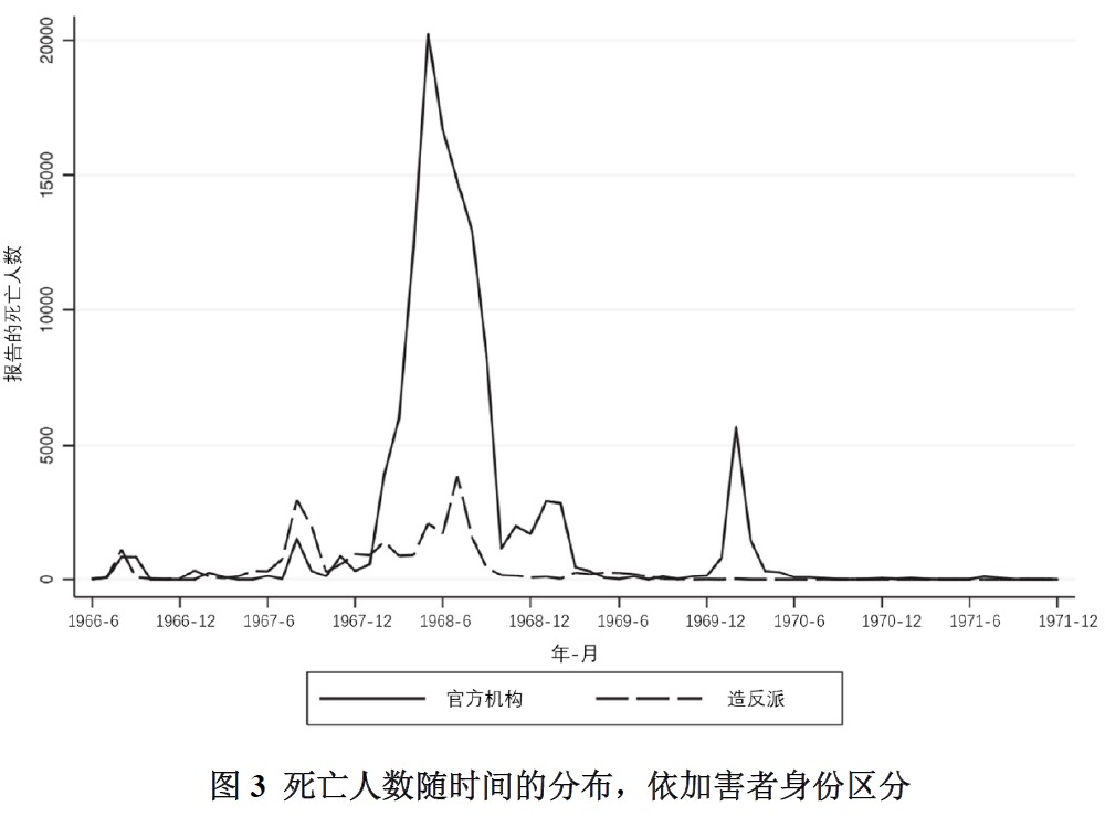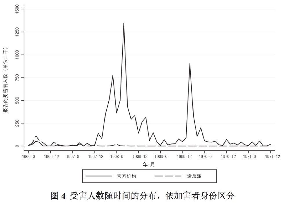 图4展示了一种更加明显的模式。造反派造成的的绝大多数受害者集中在1966年秋天造反派攻击当局和其他人时,以及1967年初造反派夺权时。从那时起,造反派之间的武斗占据了上风,造成了人员伤亡,但这些损害与早期造反运动并不相同。与1968年大部分时间里当局造成的死亡人数的高峰相比,与1970年短暂但剧烈的死亡人数高涨相比,造反派造成的死亡人数相形见绌。