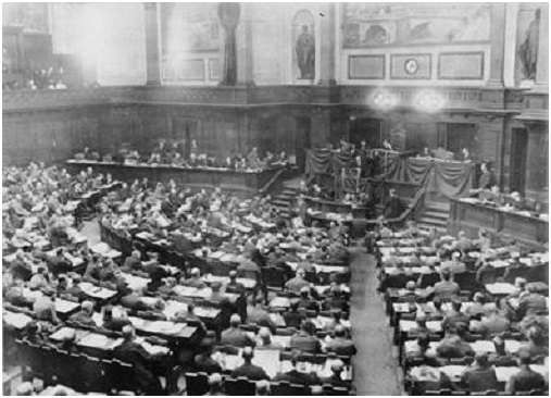 尽管左派遭到了全面惨败,但米勒和多伊米希仍未放弃。他们预计,在1919年1月19日举行的国民议会选举中,资产阶级政党将会获得大多数席位,社民党与独立党加在一起也无法获得过半席位[56]。由于柏林刚刚发生过起义,对于这样一个政府来说不够安全,所以国民会议就在魏玛召开。在魏玛,两个社会民主主义政党在起草新宪法的过程中,仍然要依赖同天主教中央党之类的资产阶级势力达成的协议。
