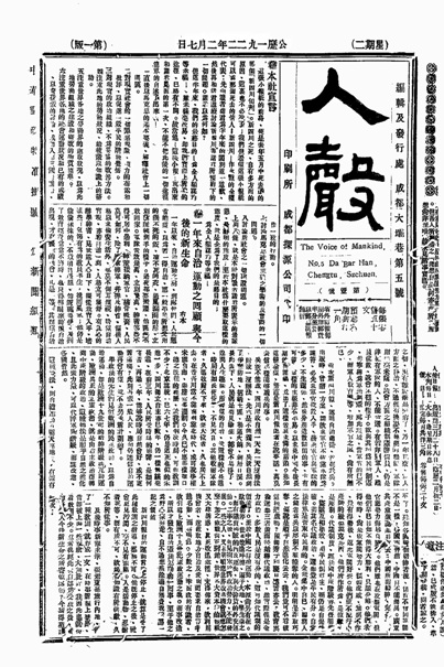 -> 四川最早宣传马列主义的报刊《人声》(1922)