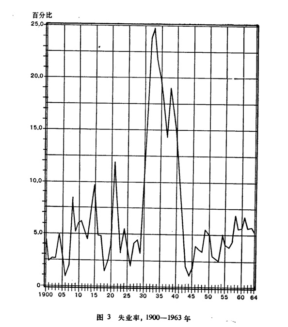对于失业数字的考察,表明剩余的吸收事实上是进行得很顺利的(表10,图3)。就整个十年来说,平均为百分之五,这个数字由于1921年的通货紧缩所造成的衰落而提高了。就1923—1929年的七年来说,平均为百分之三点九,与1900—1907年的数字接近,根据任何有关的历史标准来看,肯定是很低的。