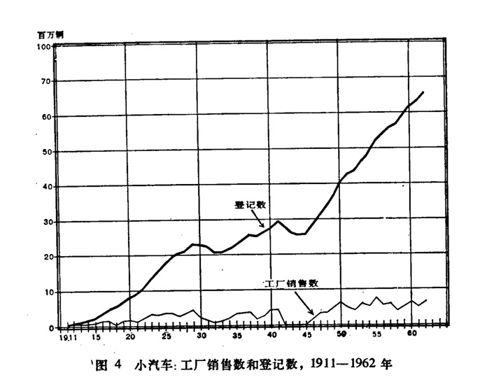 然而战争终于来到了——正在关键的时刻;而局面就从停滞变成了繁荣。在1918年11月的停战协定以后,有一次短暂的温和的“从战争时期转变到和平时期的恢复危机”,它在1919年的春天为战争后果的繁荣所代替。物价在战争中已经高涨,战争后果繁荣的第一阶段很快就发展成为投机的狂热。1922年气泡爆裂了,批发物价从1921年的一百五十四点四急剧跌落到1922年的九十七点六(1926年=100)。但是伴随着的萧条虽是剧烈的,却是短暂的:战争后果的繁荣只是被打断,没有被扼杀。特别是,对住宅和其他各种建筑积压的需求还是很强大的,并且是在以后几年经济局势中起支配作用的特征之一。同时,第一次巨大的汽车化浪潮——可以从1915年左右算起,并且在战争中连续不断地向前推进——正在达到顶峰,产生着多种多样的副产品和间接效果:市郊化,公路建筑,辅助性的工业,等等。汽车的实际生产在1929年(生产四百五十万辆)以前没有超出1923年的水平(三百六十万辆),但是汽车的影响能够更加正确地用使用中的汽车数目的增长率来表明;而在这十年中这个比率一直是很高的。图4表明1911年至1962年汽车的工厂销售数和登记数——非常接近于生产的数量和使用的数量。1915年至1929年间登记数量增加到十倍(从二百三十万辆增至二千三百一十万辆),表明了在这些年代中汽车的巨大影响。因此,这是不奇怪的:当战争后果的动力减弱时——在1925年左右,这一年建筑达到了它的最大限度——汽车化的势头已经足够强大,可以使繁荣维持更多几年。