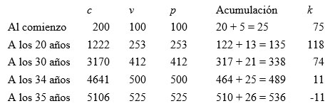 A partir del año vigésimo primero (21o) la parte de la plusvalía destinada al consumo empieza a disminuir; en el año 34 casi desaparece y en el año 35 es negativa; el Shylock del capital constante demanda inmisericorde su libra de carne, quiere crecer al 10%, mientras los pobres capitalistas pasan hambre porque no pueden conservar nada para su propio consumo.