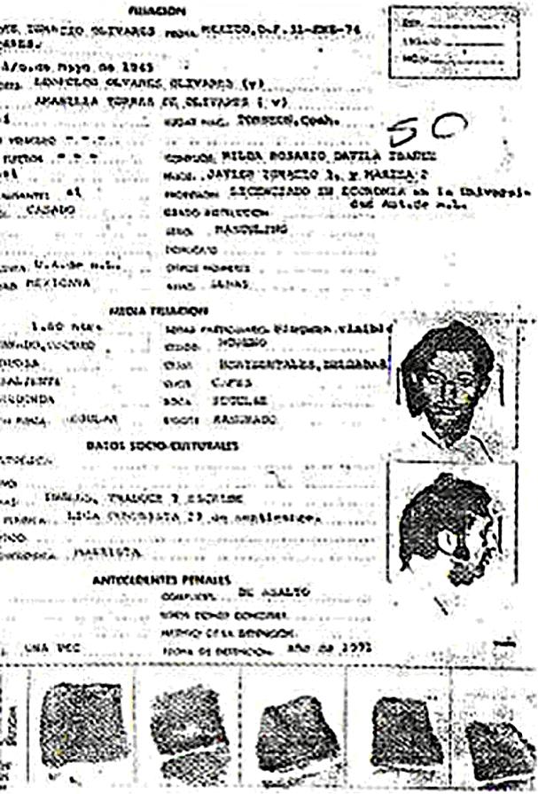 Ignacio Arturo Salas Obregón. Este individuo ha sido identificado como el fundador y principal dirigente de la Liga Comunista "23 de Septiembre", se desconoce su paradero y otros miembros de la Liga Comunista "23 de Septiembre" al ser interrogados al respecto, manifiestan haberlo conocido, pero saber que desde 1974 no se sabe de su militancia en ese grupo subversivo. Las corporaciones policiacas lo tienen como prófugo, pero se supone que este sujeto murió el 25 de abril de 1974 y que fue inhumado clandestinamente por otros miembros de ese grupo. Lo anterior se desprende de que existen datos de que este individuo en 1974, adquirió un automóvil marca Dodge tipo GTS, modelo 1969, de color azul, con capote negro, mismo automóvil que fue localizado en el fraccionamiento de Ceilán, México., con 19 impactos de bala y en el asiento del conductor una cantidad considerable de sangre y múltiples cartuchos (sic).