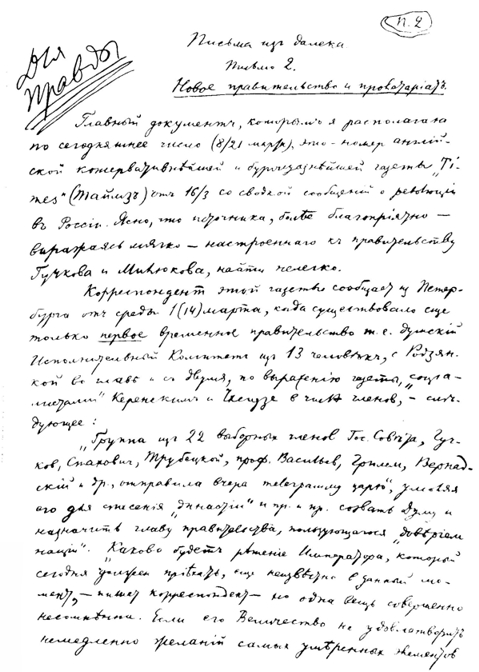 ![]() Première page du manuscrit de V. Lénine «Lettres de loin, Lettre 2. Le nouveau gouvernement et le prolétariat». 22 (9) mars |