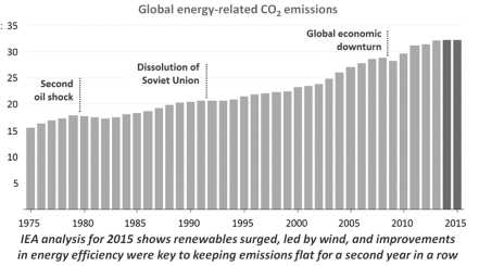 1. IEA finds CO2 emissions flat for third straight year even as global economy grew in 2016, Factor CO2, 20 March 2017 [new source]; Decoupling of global emissions and economic growth confirmed, IEA, 26 March 2016.