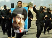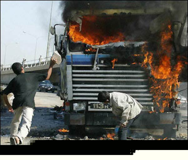 Iraqis throws bricks at a burning truck that was attacked by insurgents on the road leading to Baghdad's airport. A convoy of US army oil tankers came under rocket-propelled grenade attack in Baghdad's western suburb of Abu Ghraib. AFP/Karim Sahib