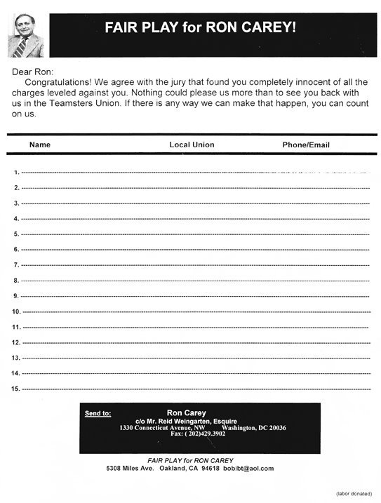 December 2001 Vol 1, No. 7 Fair Play for Ron Carey by Bob Mattingly In November, a New York jury found former Teamsters President Ron Carey innocent of all criminal charges stemming from false allegations by the unions Federal overseers. Unfortunately, the jury also could not overturn the Feds outrageous ouster of Carey from the Teamsters Union. Certainly, if the jury had the power to return the leader of the 1997 UPS strike that electrified the U.S. labor movement, it would have done so. No doubt, some of the jurors remembered the strike against UPS and cheered the strikers, as did so very many Americans. Though the jury couldnt return Ron Carey to the union and its ranks that he so proudly served for 40 years, the jury did provide an opportunity for Teamsters to take the next step in getting Carey back where he rightly belongs. Now Teamsters have the opportunity to demonstrate to all of Careys detractors inside and outside of the union that the ranks want Carey back. Soon after the jurys verdict, a UPS driver told me he wanted to see Ron Carey returned to the Teamsters Union. He had read an eyewitness report of Ron Careys trial and was convinced that the government had railroaded Ron Carey. Now, he said, he wanted to do something to set things right. I suggested that he ask the Teamsters at his package center to sign a petition, letting Ron Carey know how they felt. But I had underestimated his desire to help out. “Make me up a petition, and Ill take it to barns all over the local,” he told me. Since then, other Teamsters have begun gathering signatures at their worksites. The petition was placed on the Internet and is turning up in some Teamsters local unions outside of California. Hopefully, activities like the petition signing can spark a broad mobilization of Teamsters to demand that the government take the wraps off of Carey and the Teamsters Union. At the time the government removed Carey from the Teamsters, all of organized labor was benefiting from the shot in the arm that the successful UPS strike provided. Since then, however, the enthusiasm of that victory over UPS has evaporated. Today, organized labor, including the Teamsters Union again needs the inspiration of a fighting, democratic leadership. Facing another wrenching recession, American workers need a revitalized union movement. Bringing Ron Carey back to organized labor can be a major step in turning the union movement around. Forcing the government to retreat from its implicit attack on all workers right to democratically choose their leaders can inspire a new level of rank-and-file activity and militancy. I hope that all workers who see the petition make copies and pass it around to the Teamsters who deliver the bread and milk, potato chips and soft-drinks to the neighborhood grocery. I hope they pass it on to the school bus drivers, the big-rig drivers, and the UPS drivers. There are 1.4 million Teamsters whose power can bring Ron Carey back to the Teamsters and organized labor. If you can help get the petition out to them, thanks so very much. Ron Carey need not stand alone if you stand with him. In Solidarity,