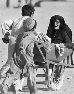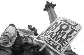 I have just arrived back from the biggest protest march in London since the early 1970s. 100,000 people from a myriad of different groups and communities participated in a three mile hike from Hyde Park to Trafalgar Square (which one speaker, Tariq Ali, informed the audience was named after the Arabic name Tarif i Algar, being the straits separating Spain from North Africa.) The demonstration was peaceful and spirited with many drummers and musicians plus clowns on stilts (no, I am not talking about the British politicians whose absence was either worth noting or worth nothing). Favorite chants included all the usual but also Arabic chants and songs from the strong Muslim contingents. Near the front of the procession was a bloc of 150 teenage Muslim girls who intervened militantly with slogans and chants. The tail end was still leaving the park as the front end entered the Square where a succession of speakers condemned the infamous bombing and brutality of the US-UK military madness.