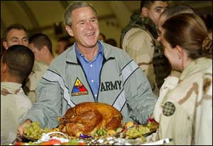 December 2003 Vol 3, No. 11 Purported Bush Tape Raises Fear of New Attacks By Robert Jensen and Sam Husseini A tape today surfaced in U.S. media outlets of someone purporting to be George W. Bush at a U.S. military base in Baghdad. Intelligence analysts around the world are studying the videotapes. “It certainly looked and sounded like him, but we get so few glimpses at Bush in real-life situations that it is hard to tell,” said one operative from a Western intelligence agency. People who know Bush said it appeared to him. “Thats him, all right,” said one longtime associate. The tape shows the man claiming to be Bush praising U.S. attacks in Iraq. “We will stay until the job is done,” he threatened. The videotape was delivered to the Baghdad bureau of FOX News by an intermediary courier who has brought material before from the U.S. military, according to the U.S. network. There were calls for FOX to be banned from some Arabic countries for broadcasting American militaristic propaganda. While the quality of the tape was not poor, the alleged Bush did appear tired in portions of it, prompting speculation that he is on the run. The man claiming to be Bush said: “We did not charge hundreds of miles into the heart of Iraq, pay a bitter cost in casualties, defeat a brutal dictator and liberate 25 million people only to retreat before a band of thugs and assassins.” Analysts pointed out that given the ongoing nature of the Iraqi resistance since “the end of major combat operations,” that comment could have been recorded anytime in the past six months. “When the man identified as Bush tells U.S. troops, You are defeating the terrorists here in Iraq so we dont have to face them in our own country, well, its a little hard to believe that even the Bush White House would try to spin that,” said the operative from a Western intelligence agency. “How could anyone believe, after all that has been disclosed about the lies and distortions used to manipulate the public into accepting this war, that U.S. troops are defending the American people in Iraq? No major world leader would be so obtuse or so low as to try to sell that to people at this stage.” Members of the Iraqi Governing Council who met with the man identified as Bush said they had met with a man identified as Bush and were delaying comment until Paul Bremer was available to tell them what their comments would be. Omar Ali, an Iraqi in a poor area of Baghdad said: “I dont understand why he didnt stay. Just because the U.S. nearly starved us with the sanctions for 12 years, killed my cousin during the invasion, busted down my door last week and is trying to find a way to steal our oil does he think that Iraqis would want to hurt him, our great liberator?” Private Charles Sanders, who has been stationed in Iraq since the invasion said: “I was supposed to be back home by now. It was really getting depressing, but this is great. Sure, I dont get to look into the eyes of my little girl, or hold my wife tenderly in my arms, but the president served me turkey!” Susan Jones in Pittsburgh, who this morning was driven to tears while watching “Dances with Wolves” on cable TV, said: “I was planning on talking over the Thanksgiving Day table with my family about how we slaughtered the Indians and enslaved the blacks, bullied Latin America and bombed Vietnam, and now were occupying Iraq. I dont know, is it just me, or do we just have this brutal aggressive side to us? But now I guess, well just talk about Bushs visit instead.” When asked whether she was certain the president had gone to Iraq, Laura Bush said she hadnt noticed her husband had left the Crawford ranch. “I assumed he was out clearing brush,” the First Lady said. Correspondents Robert Jensen and Sam Husseini contributed to this report. Disassociated Press, November 28, 2003 |