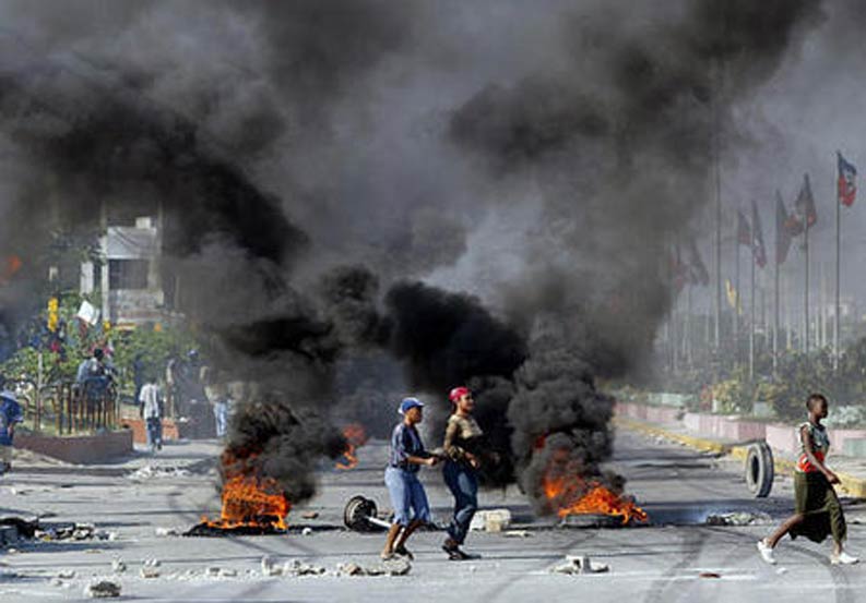 People walk past burning tires and stones on a street near the airport during a protest after Mutial Telusma, a taxi driver, was killed by U.S. Marines in Port-au-Prince, Haiti on Tuesday, March 9, 2004.