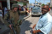 French soldiers and US Marines along with Haitian police patrol on foot in downtown Port-Au-Prince. US Marines and French troops in full combat gear, started patrolling the streets of the volatile Haitian capital together with Haitian police.