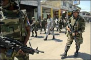 A U.S. Marine orders a man to go back to the other side of the street in downtown Port au Prince, Haiti on Monday March 8, 2004.