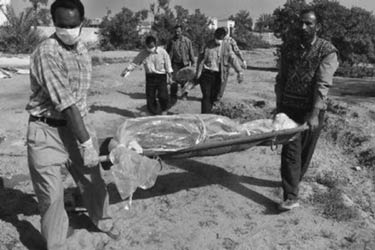 Iraqis carry the bodies of victims of suicide attacks for identification by the relatives at an open hospital morgue in Karbala, 110 kilometers south of Baghdad, Iraq Thursday March 4, 2004.