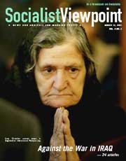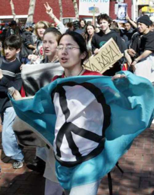 This picture was taken at the January 18, 2003, demonstration to stop the war in San Francisco. By 2 PM when this march scene was taken, the Civic Center destination was jammed with protesters, yet the one and a half mile march was still forming along the waterfront in the far distance (not visible).